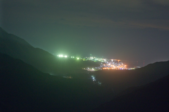 宮之浦の町までは車道を進む。当然の事ながら、トレイルを楠川に抜けるのは遭難の危険が高いということは分かっているため、夜に使う事はない。最初200メートル程度だけゆるやかな上りだが、以降はずっと下りのロードダウンヒル10km。空には満天の星が輝いている。前回屋久島に来たときに、永田いなか浜で海ガメの産卵を待つ間に見た星空を思い出す。はっきりと見える天の川に感動をしたものだ。今回の旅行では初日の夜から雲が出て来て、星空が見れない夜が続いていたが、最後に夜にすばらしいものが見れた。東京の冬の空では目立っているオリオン座が星々の中に埋もれてしまうぐらい多数の星が見える。途中からはライトを消して星明かりだけを頼りに進む。瀬戸内海直島の南寺のジェームズタレルの作品で、真っ暗な空間で15分くらい経つと見えてくるというアートがあったが、暗い中だからこそ感覚が研ぎすまされる。星明かりと眼下に見える町の灯り以外の光がない中で、山の稜線や路面のセンターラインがはっきりと見える。