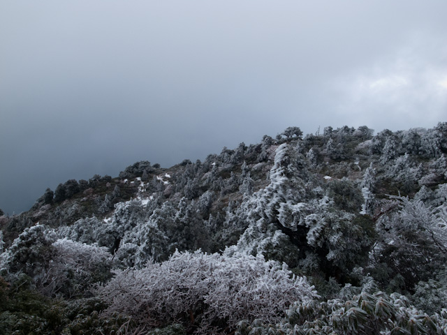 花之江河からずっとここまでの稜線はガスっていたが、この辺りから時折雲が途切れて遠くまで見渡せるようになる。どうせなら宮之浦岳山頂で雄大な眺めを楽しみたかったが、いかんせん薄着で風が強い所に長く留まるのは自殺行為に他ならないため、仕方あるまい。高度が下がって来て再び樹林帯へと入ってくると樹氷の森が美しい。樹氷と緑の葉のコラボレーションはなかなか見れる場所がないだろう。新高塚小屋の所で2本持っていたペットボトルの1本目がなくなったが、水場に煮沸して飲んで下さいと書いてあるのを見て、水の消費ペースが遅くて助かったと思った。新高塚小屋を過ぎて、だんだんパウダースノーから湿り雪に変わって来て、足を取られる事も少なくなったのでスノースパイクはお役御免。何度も外れて上手くつけられないという根本的な問題はあったが、明らかにずぶずぶと沈む新雪の場所では役立った。森の中に日が差し込み雪はどんどん解けていて、暖かさすら感じる。高塚小屋もスルーしてようやく縄文杉に15時半前に到着。反対側から上って来た人にちょうど出会ったが、この時間には日帰り登山客は既に撤収しているので縄文杉をほぼ独占できる。
