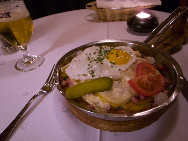 スーパーは19時で閉店、レストランも高いので何軒か見てようやく決めたところに入ろうとしたらラストオーダー終わったよとの言葉。よく見たら21時半ラストオーダーで21時29分だったのでいいよと言われてその店で食べることに。食事はローシュティと呼ばれるジャガイモ料理、ビールに良く合う。