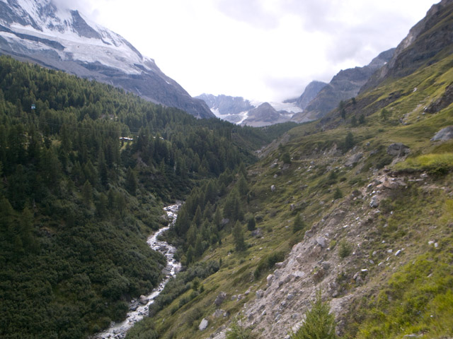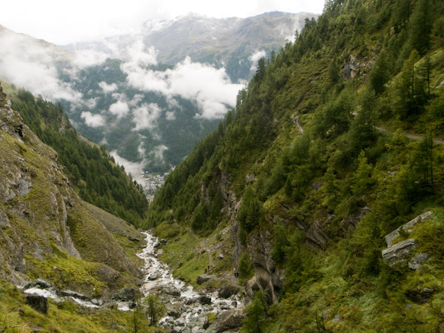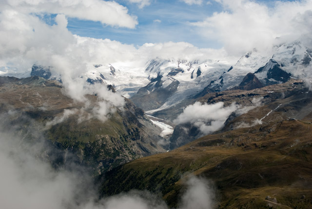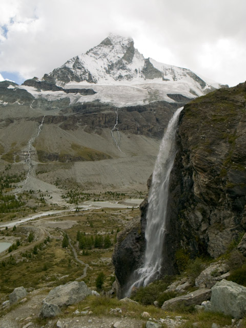 マッターホルンの先端部に雲がかかってしまっているので雲がなくなる瞬間を見届けようと何度か止まりながら進んで行く。マッターホルンと氷河に削られた谷、氷河から流れ出る水の貯水池が見える。また、後方を振り返ると氷河をいだく山々が見えてこちらもまたすばらしい景色である。谷から上る雲によって何度となくホワイトアウトに見舞われるも、眼下に雲があることでますます空中散歩のような感覚を味わえる。貯水池に近づいてくると谷まで一気に下る。谷の雪解け水が流れる川に沿って進み、崖を下る箇所には見事な滝があった。しばらくして上り返しがありまた山腹を行くトレイルになる。