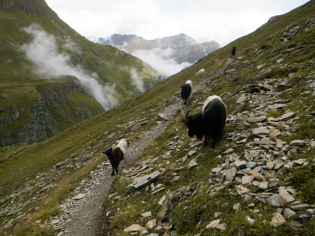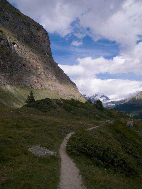 再び歩き始める。鈴の音と多数の影が反対側から近づいてくる。最初は人かと思ったがヤギの集団が崖の上から下りてきたのであった。よく飼いならされていると感心。このTriftからの上りが終わってトラバース道に入ると正面にマッターホルンが見えてくる。こちらの山に尖った峰はたくさんあったが他のもの比べて存在感が圧倒的である。ずっとマッターホルンを眺めながら緩やかなアップダウンのある道を歩き、下りは時折走る。