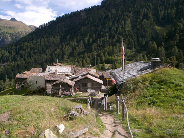 道なりに進んでいるとZmutt集落に到着。マッターホルンの麓で身を寄せ合うように家屋が立ち並ぶ小さな小さな集落である。Zermattの全景が見えてくる。背後に聳える大きな山稜を見て今日はあの上を歩いてきたのかと思うと感慨深い。