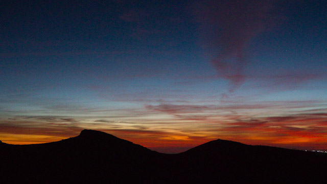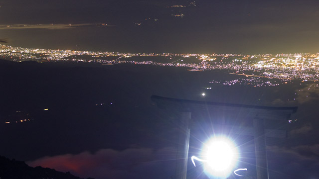 3,460mの9合目にてしばらく休憩。ビッグマックを食べるなど一息つく。だんだん上りが辛くなっては来ているが高山病の影響は思ったほど出ていない。ここでゴアテックスジャケットを着たが、まだまだ短パンで問題ない。風が穏やかで心地よい夜だ。先行する人のライトの灯りから頂上がどの辺かも見えてきてあと一踏ん張りという感覚がする。そしてようやく頂上に到着。今回、富士宮口からの登頂は初めてであったが、浅間神社奥宮の雰囲気といい、最も趣のある登頂地点である。富士宮口からでは死角になってご来光が拝めないので、スマホを取り出して調べた結果、剣が峰に移動する事にした。富士山頂でも余裕で電波が入るというのは便利である反面、俗世間から切り離された聖域が侵されたようで複雑なところではある。剣が峰頂上に着く頃に周りが明るくなり始めた。ご来光が間もなくという時の空の色の移り変わりはいつ見ても気分が高揚する。その瞬間が近づくにつれて人もまばらだった剣が峰も、いつの間にかご来光待ちの人で埋め尽くされてきた。そして、、、かなり空も明るくなりまだかまだかと待ちわびていた瞬間に雲海の先からご来光が昇って来た。日本最高所から見るご来光はやはり格別である。画的な美しさではない、この場所だからこそ感じれるものがたしかにある。