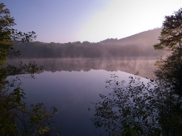 朝の鏡池。朝もやが漂う中、朝日が戸隠連山に当たり神秘的な風景。