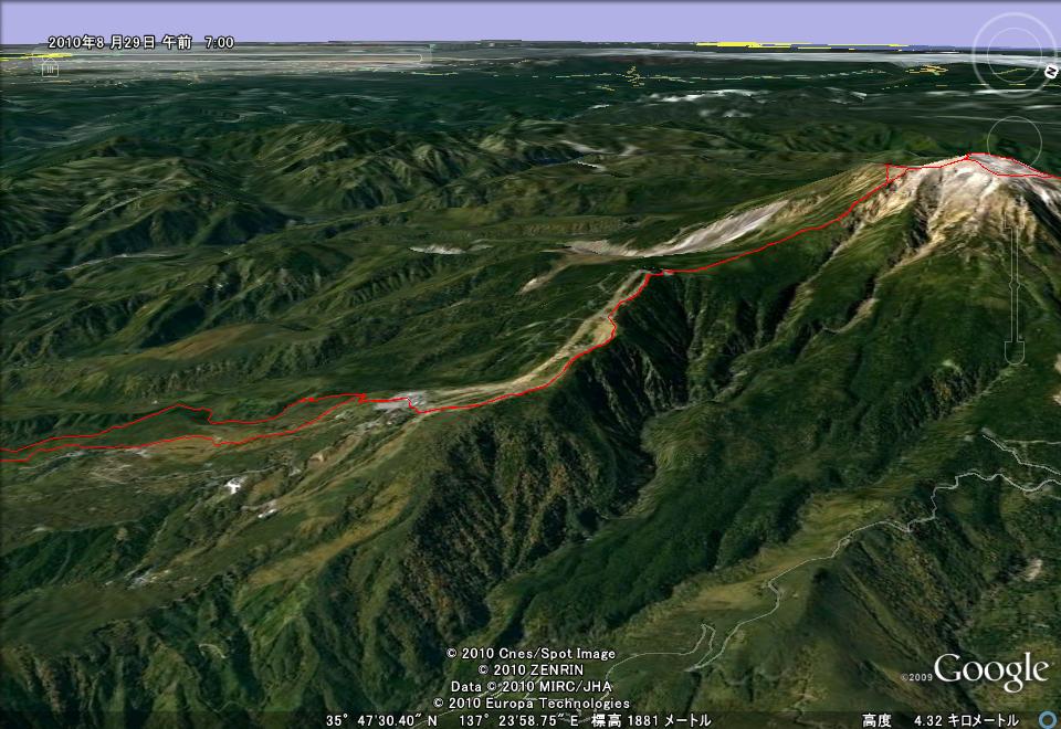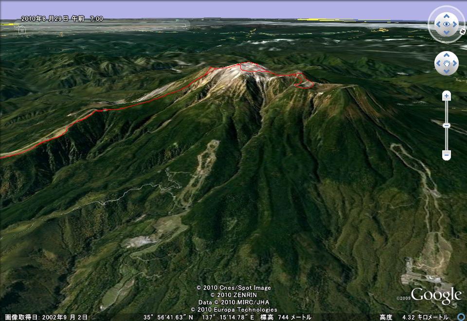 GPSの計測データをGoogle Earthにプロットし、鳥瞰的にコース状況を見た。赤い線がコースを示す。コースが行きと帰りで違う部分は、常に上りが画像の奥側の線で、下りが手前側の線である。Google Earthの画像はクリックで拡大可。併せてコース途中で取った写真も掲載する。改めて見るとすごいコースだと思う。お鉢巡りの部分を除けば、一方的な上りと一方的な下りしかないことがよく分かる。