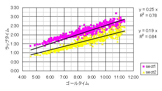 sect3(三の池)まではゴールタイムとの相関性が高いが、sect4、sect5では若干ばらつきが大きくなっている。sect3までは上りということもあり、全体的なスタミナとの相関性が高いためゴールタイムとも相関性がよいのだと思われる。sect4は山頂から田の原までの下りであり、岩がゴロゴロで足場が悪いため体力よりもテクニックがものをいう箇所である。sect5はスキー場の下りと体力が果てている人には地獄のようなロード区間のため、こちらもバラツキは大きい。