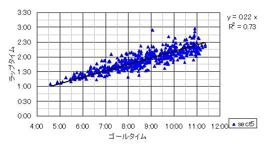 まずはゴールタイムと各関門間の所要時間の関係について。道志村で作成したものと縦軸・横軸が異なり、横軸にゴールタイム、縦軸に関門間のラップタイムを示す。sect1はスタート~第一関門で、第四関門~ゴールのsect5まで全体を5分割している。プロット位置が左にあるほどゴールタイムが早く、下にあるほどその区間が早いことを示す。自分のプロットされた位置を基準に上下を見る場合は、自分と同程度のゴールタイムの人とセクション間ラップタイムを比較することができ、左右を見る場合は、自分と同程度のラップタイムの人とゴールタイムを比較することができる。また、近似直線より下の場合はゴールタイムから見た標準的なセクション通過タイムより早いことを示し、上の場合は遅いことを示す。