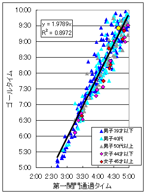 まず、第一関門通過タイムとゴールタイムの関係を示す。非常にきれいな相関関係が見て取れる。