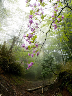 3合目〜2合目はブナ林の中を通るが、越後松之山の美人林に勝るとも劣らぬ美しい森だった。その森の中を真っすぐ続くふかふかのトレイルをひたすら走る。ずっとゆるい下りなので非常に走りやすい。森の中には花が咲いているところがいくつもあり心をいやしてくれる。鳥のさえずりと雨の音、自分の息遣いだけが聞こえる中をゆっくりと進む。
