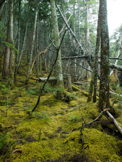 奥庭山荘の脇から3合目まで下る道は苔が絨毯のように広がる森で苔寺も顔負けの景色だった。ただし、この区間は倒木が多く、またガレ気味のところもあるので下りとはいえサクサクとは進めない。特に雨降りという事もあり倒木に乗ると滑るし、倒木が腰くらいの高さになる大木だったりして慎重に通る必要がある。またガレている箇所や踏み跡が分かりづらくなっている所も多く、この日行ったコースの中では最も気を使うところだった。