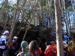 本栖湖畔からは竜ヶ岳の手前の端足(はした)峠を目指す。本栖湖からは逆さ富士の見える北岸の方からは富士山がきれいに見えるが、南岸からは竜ヶ岳をはじめとした山にさえぎられて富士山の山頂部分しか見ることができない。湖畔の急階段を上ると湖に沿ったコースとなり、本栖湖の澄んだ水の色が美しい。紅葉の時期、新緑の時期、雪の時期、四季折々の景色が楽しめると思う。ただし、人が入っていないせいか崩れかけている部分や、枯れていたからよかったものの、藪になっている部分もあったので万人向けではない。湖畔の道を後にして峠への上りが始まる。六花先生があとちょっとと言ってからも延々と上り、さらに竜ヶ岳が大きく眼前に見えるポイントで、その脇の峠までかなり長いことも確認できて一瞬嫌になるが、それでも上っていく。ちなみに上りで辛い中もI嬢と関西から出身のHWさんは腿上げしたりしながら軽やかなステップで上っていた。楽しそうに飛び跳ねて上る姿が信じられない。