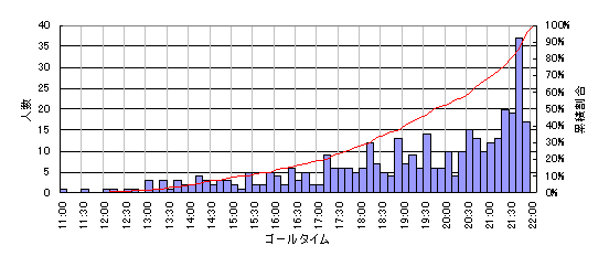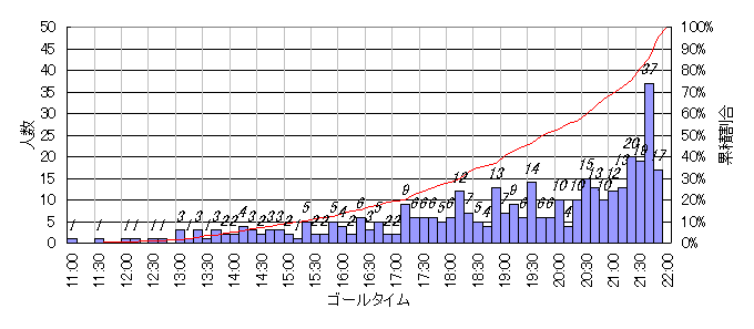 このレースの場合は最頻値がもっとも代表的なポイントになると思う。多くの人が制限時間と闘いながら完走したという特徴が表されている。単純に走力にものをいわせてゴールタイムが決まる短いレースとは違い、長距離のレースで多くの人がどこかにトラブルをかかえていたので、制限時間ぎりぎりでゴールできればいいという考えで走っていたことがこのようなゴールタイムの分布になった理由かと思う。早くゴールすることより、確実にゴールにたどりつくこと、これが図らずも大半のランナーのテーマになっていたのではないか。知り合いの中でも、がんがん突っ込んでいく男性陣の不調とマイペースで進む女性陣の健闘が目立ったレースであった。
