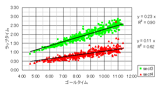 sect3(三の池)まではゴールタイムとの相関性が高いが、sect4、sect5では若干ばらつきが大きくなっている。sect3までは上りということもあり、全体的なスタミナとの相関性が高いためゴールタイムとも相関性がよいのだと思われる。sect4は山頂から田の原までの下りであり、岩がゴロゴロで足場が悪いため体力よりもテクニックがものをいう箇所である。sect5はスキー場の下りと体力が果てている人には地獄のようなロード区間のため、こちらもバラツキは大きい。