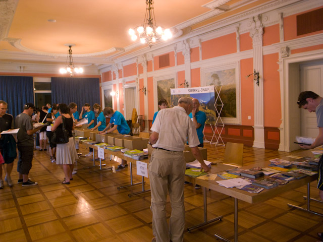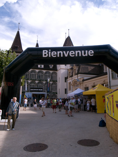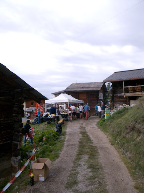 Sierreの駅に到着するとトレランシューズを履いているなど明らかにレース参加者と分かる人が多数同じ列車から下りたので受付会場までもスムーズにアクセスできた。レースの受付もスムーズに行われ、ナンバーカードと当日の諸注意の紙をもらい、宿舎と朝食の場所について教えられる。受付会場周辺のカフェはレース参加者で大賑わいでかなりビール臭かった。会場では冠スポンサーのSALOMONの他、スポーツドリンクメーカーなどが出店していた。スイスフランのレートが高いせいで日本と比べてもすべてが割高の感があったが、水に溶かすタブレットだけ購入し早速翌日のレースで使った。会場周辺には引き締まった体つきのいかにも速そうな人ばかりだったのでかなり不安になる。付近のレストランで夕食を食べようと見て回るがどこもなかなか高く、結局1800円くらいのスパゲティを食べた。主催者が用意した宿舎というのがまた驚きで、狭い地下室に無造作に3段ベッドが並んでいる異様な空間であった。時差ぼけもあり熟睡できるはずもなかった。