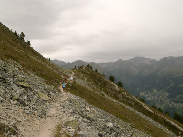 12km地点の第一関門に2時間35分くらいで到着。ここまでずっと上り。ここのエイドは集落の外れにあり、地元の人達が暖かく迎えてくれる。エイドの先に標識があったが時間の目安としてゴールタイムの45パーセントということだ。脚の痛みと体の重さからブレーキがさらにかかってさきほどの上りで難なく抜かした選手にもどんどん抜かれて行く。下りでも走ると脚が痛む危険性があるのであまり飛ばせない。急な上りも終わり山腹のトラバース道の緩い上りが主体になりつつあったがペースが全く上げられないままずるずると進んで行く。