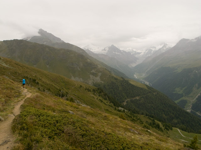 上りがそろそろ終了となる残り10キロあたりでハイキングコースの標識にZinal 3h30mとある。この時点で経過時間は4時間20分ほど。ハイキングのペースの倍で行けば何とか6時間には間に合いそうである。残り5キロあたりから Zinalの町が眼下に見えてくる。谷間の森にたたずむ小さな町である。山腹をトラバースしているコースは直線的ではないためなかなか見えているのに近づかない。飛ばそうとすると脚が痛むが、とにかく脚が引きちぎれようとも意地でも6時間は切りたい。別に順位が最下位に近いことも分かっているし、完走目的なら6時間切れるかどうかなどどうでもいいことである。しかし、この最悪のコンディションの中で自分に負けないためにやるしかない。