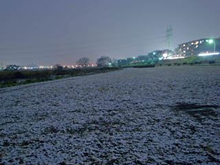 近所も路面は全く積雪がなく、車の上や植え込み、空き地などが白くなっているような状況。多摩川沿いでもうっすらと雪化粧をしている程度でしっかりと積もっているということはなかった。始めは雪上をサクサクと踏みしめて走っていたが、積雪がないところでは水溜りに頻繁に足を取られた。夕闇の中足元の水溜りがよく見えなかったためしかたないが。一回濡れてしまうと寒さと相俟って足の中が非常に冷える。