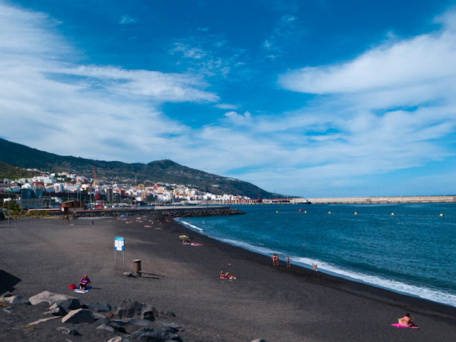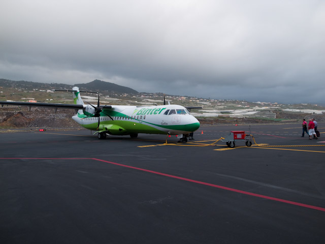 デュッセルドルフからラパルマ島までは4時間半くらいのフライト、ルフトハンザと同じドイツの航空会社、エアベルリンを利用したが、こちらはEU内のフライトでアルコール提供無し。ドイツから西欧をポルトガルまで横切ってカナリア諸島へ向かうルートを飛行する。割と長いフライトなので、通常であればトイレに席を立ちやすい通路側の席を選ぶがあえて景色が見えることを期待して窓側の席を選ぶ。途中までは雲しか見えなかったがスペイン本土あたりから雲がきれ、残雪の山並みや丘の上に並ぶ無数の風力発電が見える。ポルトガルを過ぎてしばらく海の上を飛んだ後で、ラパルマ島の全貌が見えてきた。島の海岸線と平行に飛んでからUターンする形で空港へ着陸したので、島の様子もよく分かる。ついに到着、期待と不安を感じつつラパルマ島、別名isla bonitaへと降り立った。