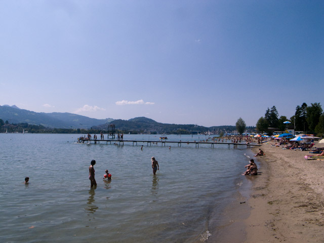 一旦ホテルに戻り、まずは当初の計画通り翌日のレースに向けて筋肉をほぐす意味も含めスイムに行くことにした。バスで湖岸を移動してビーチのある施設LIDOへと向かうことにする。ルツェルン湖の水はすごく冷たかったが、いい天気なので気持ちいい。ビーチと沖のブイを行ったり来たりしながらのんびりと過ごす。白鳥の群れが泳いでる横を通って行くのも湖ならでは。