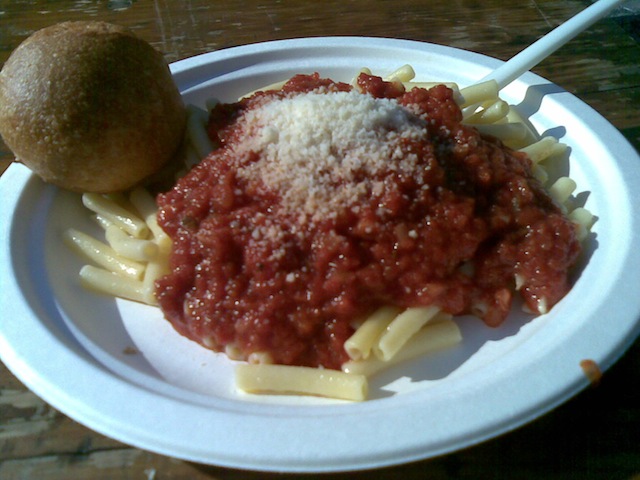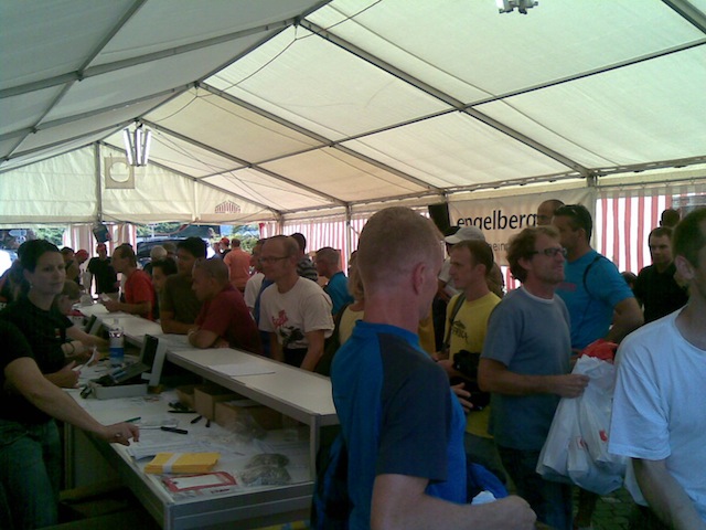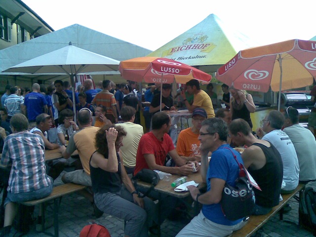 ホテルに戻るとちょうどいい時間だったので電車にて受付へと向かう。ナンバーカードを受け取り、荷物を預ける。中間地点とゴール地点の2箇所に荷物を運んでもらうことが出来るが、中間地点にサプリ類を送っただけ。も ちろん希望すれば着替えやシューズを送ることもできる。プログラムにはスパゲティパーティとあったのでカーボローディングにスパゲティ食べ放題を期待して いたが、残念ながらペンネかラビオリでソースが3種類からの選択で1杯食べれるだけ。そして18時半からのブリーフィングに出ろと言われていたので出た が、すべてドイツ語でコースの解説や注意事項を説明しているので何も理解できない。ドイツ語は全く学んだことがないので一切分からない言語である。