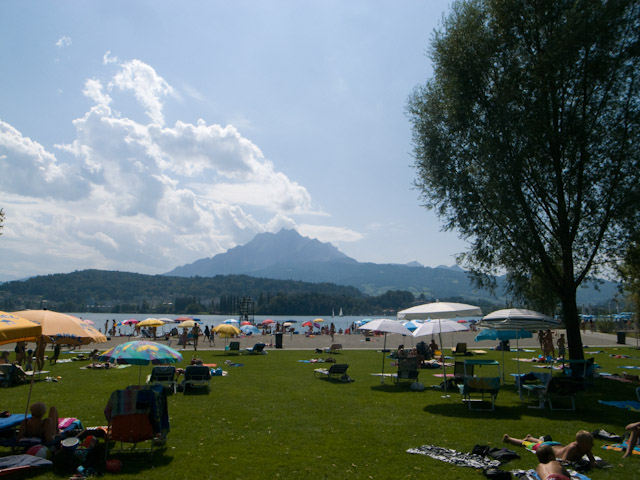 ルツェルン湖を臨むビーチ、どこからでもPilatus Kulmは目立つ