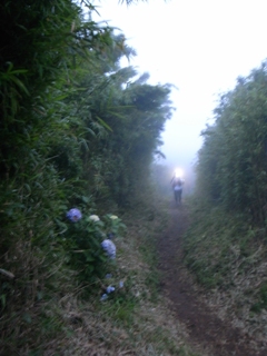金時山山頂到着が18時で、日没まであと30分ほどで、ライトを持っていない方が何人もいるという状況だったので仙石原に降りて終わりということになった。下 りの最中で日没時刻を過ぎ、木立の中は一気に真っ暗になってしまっていた。ライトを持っていない人の後ろを走り、前方を照らしながらの走行したが、真っ暗闇の場所が何箇所もあり、冷や冷やであった。トレイルを出た後も箱根湯本駅行きのバスまで時間がないということで皆でバス停までダッシュした。何とか皆間に合ったが、汗と雨でびしょ濡れの集団はバスの中でかなりのヒンシュクだっただろう。