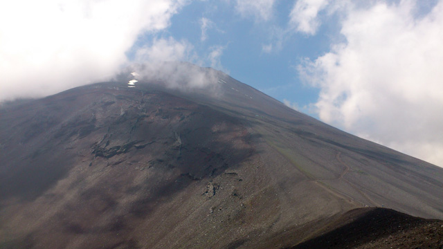 樹林帯が終わると宝永山の火口付近に出る。すぐ脇は富士宮口ここからがいよいよ本格的な富士登山が始まる。宝永山の火口を横切り、あり地獄のように足を取られて上りにくい砂礫の坂を上る。時折、雲が途切れると山頂まで見渡せ心躍る。宝永山山頂に出ると少々頭痛の気配がする。まだ2,700メートル程度だというのに高山病の予兆のようだ。ここから御殿場口新六号目に出て坂はますますキツくなる。七合目を過ぎた辺りから身体がかなり重く感じられ、思うように足が進まない。登山者に混じってトレイルランナーの姿も見かけたが、その中には知っている顔もちらほら。