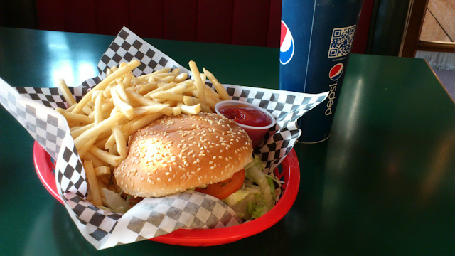 メインストリートの南にあるハンバーガーショップ。ドリンク含め$13。レース前最後の夕食、他に一組いた客は2人ともペーサーとしてレースに参加。健闘を誓い合う。