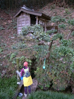 菊名の名水。崖の中腹に祠があり、その下でちょろちょろと水が湧いている。さすがに煮沸しないと飲めないようだ。