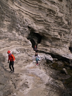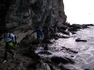 侵食された断崖と岩礁地帯を進む