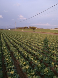 夕暮れ時の大根畑。奥の木立のところに最後の七福神ポイントがある。