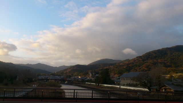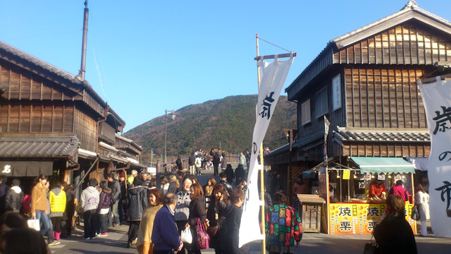 奥の橋を渡って来て右方向へ行き、伊勢神宮の橋の手前のロータリーで折り返す。朝にレースのコースとして使われたのがウソみたいに観光客でごった返す