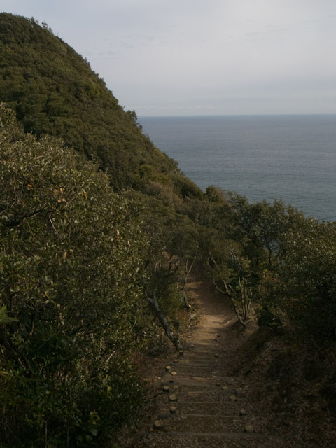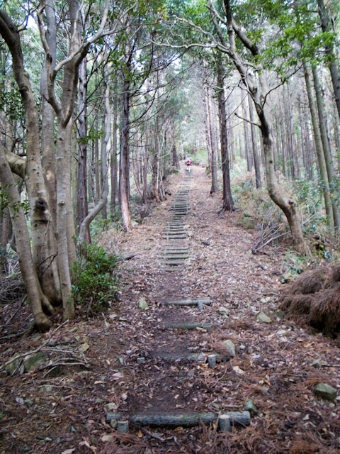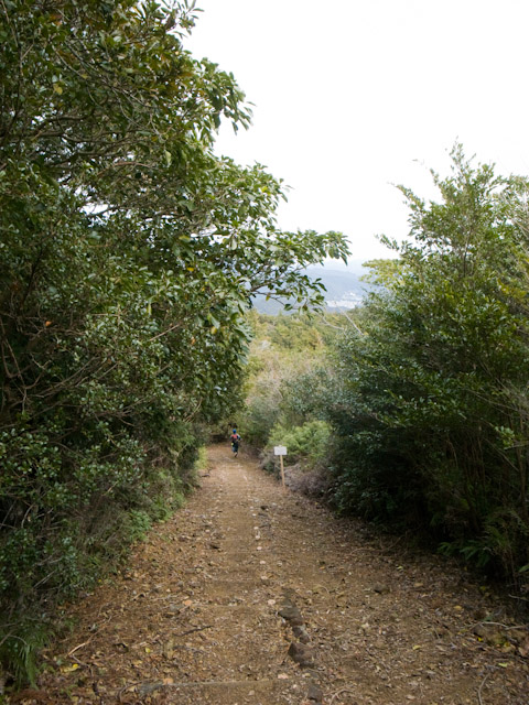 遅いペースなので淡々と進んでループをまたコース最高点に向かい上り始める。この区間のみが薮の茂る岩場のような所の上りでこのレースの中では通行に唯一気を使った場所である。そしてまたエイドへと戻る。集落の外れにあるエイドではバナナやパン、そして焼きもちが用意されていた。この焼き立ての餅が非常においしかった。そして地元のおばあちゃんのまた来年も来てねという笑顔に癒される。この先はまたまた階段のアップダウンが続く。スタート後の失速時よりは回復して来たとはいえ、いつまでも続くかに思われる長い、長い階段は辛くなる。しかし、これまでに出て来たレースに比べて厳しいコースというわけではない。リズム良く、と自分を鼓舞しながら進む。それにしてもこのアップダウンの多い区間は海崖の上のトレイルなのだが、波の音は聞こえるのに海は林の先の断崖の下なのであまり見る事ができない。このレースは距離表示をしていないのだが、この区間は整備された道なので標識が時折あり、日和佐の町に近づいている事は分かる。