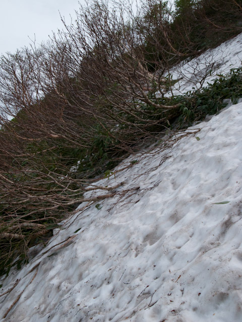 トレイルは頂上を目指してひたすら上るだけ。結構きついと思って振り返るとかなりの斜度であることに気付く。しかも足元は粘土系の滑りやすい土である。下りは大変だろう。そろそろ森も終わり頂上が近くなったかというところで、雪の激上りが現れる。踏み跡を見る限りトラバースではなく直登である。傾斜もきつく、上れたとしても下るのは非常に厳しいだろう。すぐさまこれは危険と判断して下山を始める。