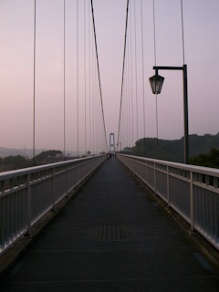 スタートは最近まで日本一を誇った人道橋、龍神吊り橋である。渋滞回避のためトレイルの入り口を一旦素通りしてから回り込むようにしてトレイルへと入っていく。トレイルに入ってすぐのところでは渋滞が少々起こる。しかし、この後はどんどんばらけていったので渋滞はこの区間だけである。ただし、出走が400人弱と少なかったことも多分に影響していると思うが。川沿いの狭いトレイルを進むとロードに出て集落の商店街を通りながらしばらくはエイドステーション近辺までロードを進む。エイドの東金砂神社の参道から再びトレイルに入り、境内のエイドを過ぎるとひたすら上りの階段が待っている。ここから第一関門までの区間は大して印象に残っていない。第1関門からトレイルを上って下ってロードに出るとすぐに第3関門エイドである。ここが公称24キロ地点で半分に当たる。しかし、ここから先が本番で、距離は半分でも、まだまだコースの序の口が終わったに過ぎない。