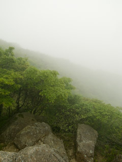 鈴鹿山地にはヒルが多いと聞く(これまた丹沢と似ているが)ので、足元は膝下までくるリガードソックスを履き、ディートの濃度が濃い虫除け剤「ムシバイバイ」をしきりに散布しておく。止まるときはなるべく開けた岩場にして濡れ落ち葉の木立の中は速やかに通り過ぎるよう気を使う。こうして自分なりのヒル対策をしていたつもりだったが、何と御在所には基本的にヒルはいない(ゼロではないがほとんど出くわさないらしい)ので大して意味のないことをしていたようだ。もちろん足回りへのブヨなどの攻撃は防げたかもしれないが。