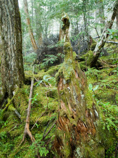 奥庭山荘の脇から3合目まで下る道は苔が絨毯のように広がる森で苔寺も顔負けの景色だった。ただし、この区間は倒木が多く、またガレ気味のところもあるので下りとはいえサクサクとは進めない。特に雨降りという事もあり倒木に乗ると滑るし、倒木が腰くらいの高さになる大木だったりして慎重に通る必要がある。またガレている箇所や踏み跡が分かりづらくなっている所も多く、この日行ったコースの中では最も気を使うところだった。