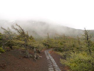 5合目に向かうバスは他には白人旅行者が2人乗ってるだけという計3人の非常に寂しい感じ。5合目には観光バスの団体がいくつかいたが、8月の最盛期と比べると当然のことながら人もまばら。お中道を通り、雪渓が一部箇所で登山道を覆っているため一応通行禁止になっている。山頂を眺めると雲の流れが早く、もしかしたら山頂が一瞬でも見れるのではと思い眺めていたが、残念ながら見えそうで見えないままだった。