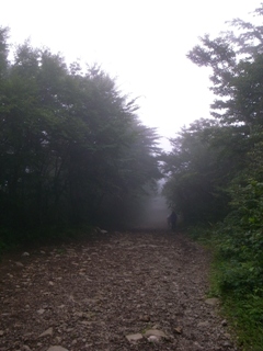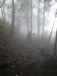 霧の中、分岐点(どちらも駿河小山駅と書いてあった)で先行する集団とはぐれ、どちらに行けばいいのかで悩んだ。足跡がついていないといということでかなり不安ではあったが、山道100%県境の尾根コースという方に進み、結果としては正解で先行集団が待っていてくれた。