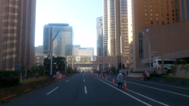 並んでからすぐに国歌斉唱やら都知事の挨拶やら始まる。並んだ場所はスタートからの列が折れ曲がる場所だったが、距離があるためにセレモニー関連の様子は見えない。薄着であったが、周囲に人が多数いるため寒さは気にならない。車いすの部が5分先行してスタートして、すぐにマラソンもスタートとなる。スタートラインまでは完全にノロノロ歩きで6分強、過ぎてから周りも走り始める。前の方のブロックの人が脱ぎ捨てたビニール合羽が散乱しており、スタート直後にしてつまづきそうになる。後のランナーのことも考えて、スタート直前に脱ぐ人は責任持って処理してほしいところだ。都庁前の通りこそゆっくりペースだったが、道を曲がってからは周りのペースも上がり、そこそこ走れるようになる。あっという間に大ガード下をくぐって1km地点に到着してスタートから5分15秒で到着。目標ペースと同じであるが、スタートロスも含まれている分だけ明らかに速い。しかしまだまだ序盤もう少し走れば落ち着くだろうと思い先へと進む。
