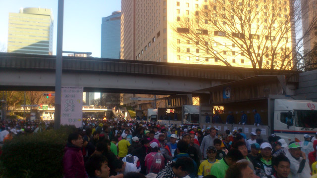 7時40分頃に新宿駅に到着。周辺ビルのトイレを使うなというお達しが出ていたが、ビルのロビーからして占領されてランナーが着替えている。知り合いに会えるかと思ったが、人が如何せん多すぎて全く分からない。寒かったので荷物をギリギリに預ける。本日の装備はハニースティンガージェル×2、ベスパ×2、トップスピード×1、塩飴×1である。スタートラインに並ぶ前にトイレに行こうとするも長蛇の列ができている。どこにどのくらいのトイレがあるのか、そして列がどうやってできているのかを把握していなかったために無駄に並んでしまった。ようやく自分の番が回ってくる頃にスタートブロック締切の放送が流れている。大急ぎで用を足してスタートブロックへとダッシュをする。危うく最後尾に回される可能性もあったが何とか間に合った。